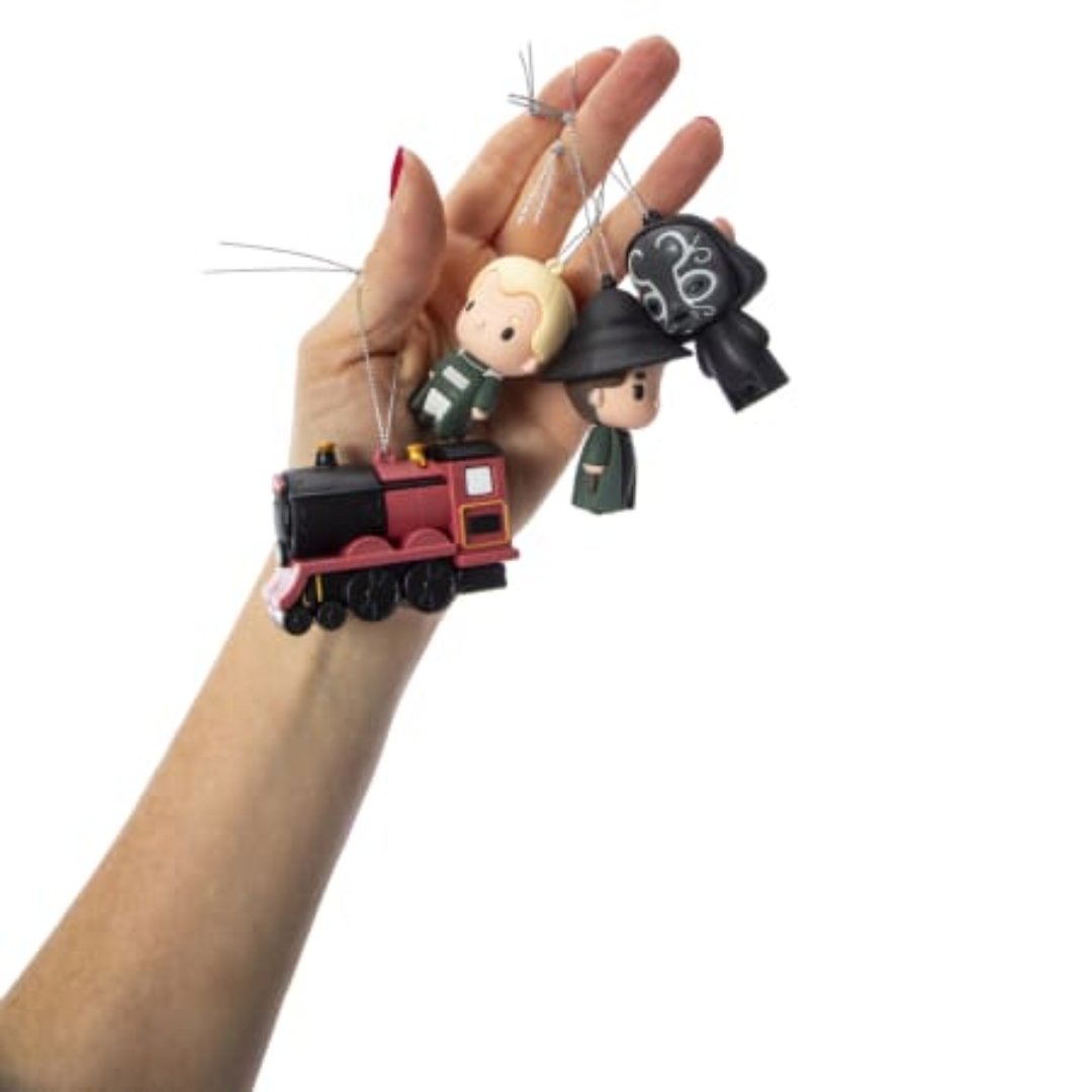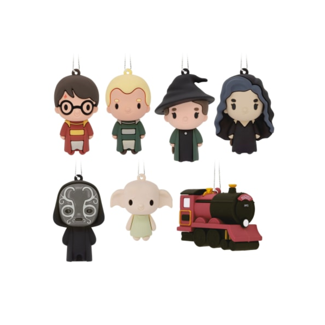 Cada compra incluye 1 caja de Hallmark con 1 adornos sorpresa, enviados al azar entre estos clásicos del Mundo Mágico: Harry, Malfoy, McGonagall, Bellatrix, Dobby, un Mortífago o el codiciado Hogwarts Express edición rara.