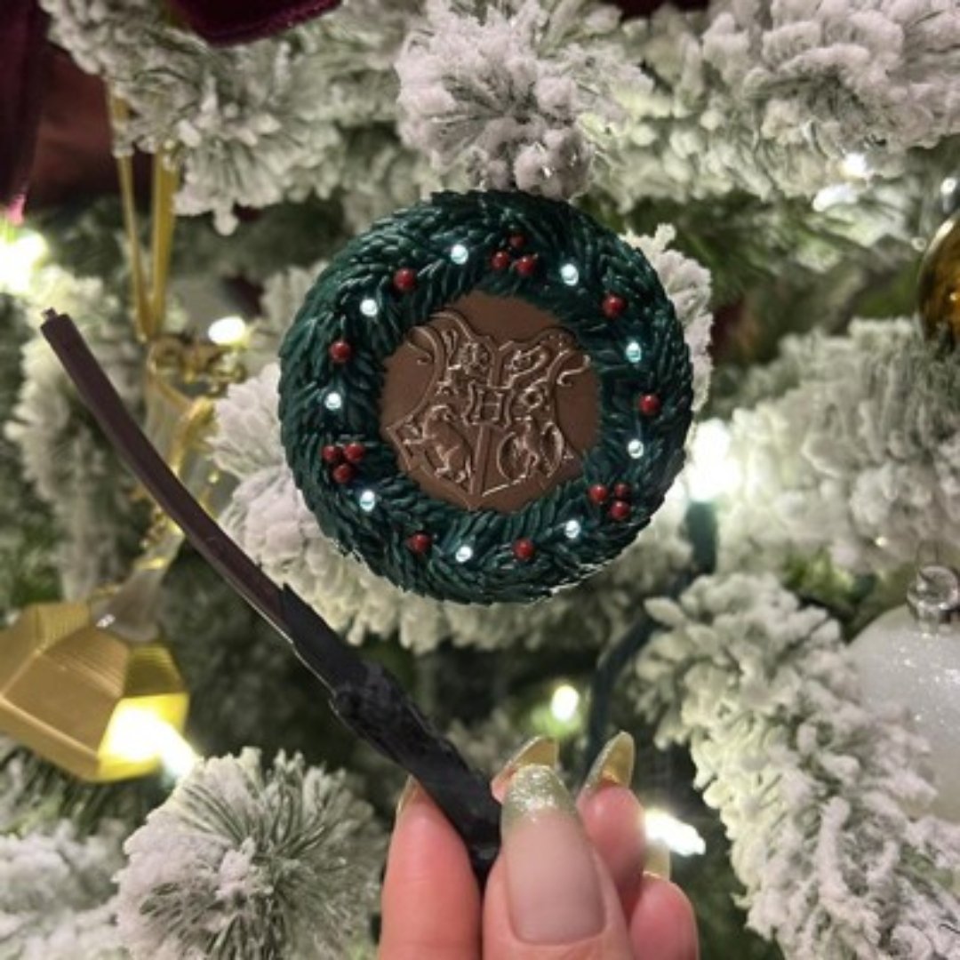 Corona de Navidad de Harry Potter de 8 centímetros con el escudo del Colegio Hogwarts de Magia y Hechicería en el centro se ilumina magicamente con tu varita que viene incluida.
