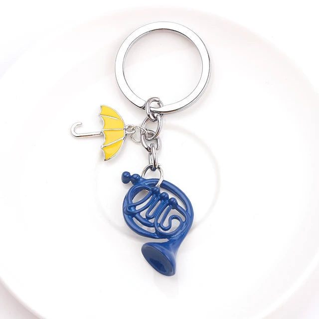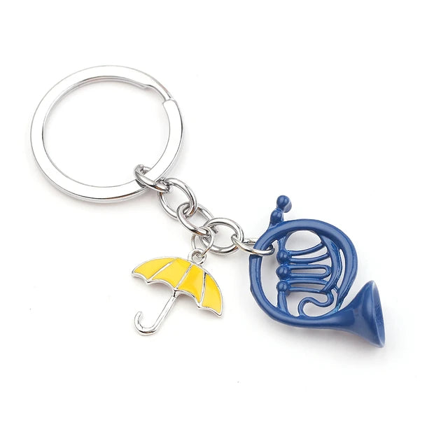 Este llavero combina el corno azul y el paraguas amarillo, dos símbolos icónicos que representan el amor y las conexiones en How I Met Your Mother.