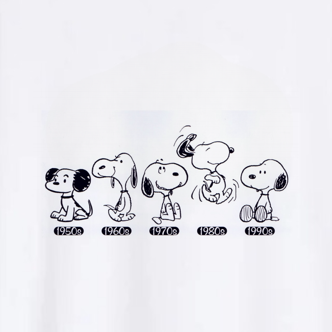 Revive la evolución de tu beagle favorito con este diseño que muestra a Snoopy en sus versiones más icónicas, desde sus primeros días en 1950 hasta el entrañable personaje que conocemos hoy.
