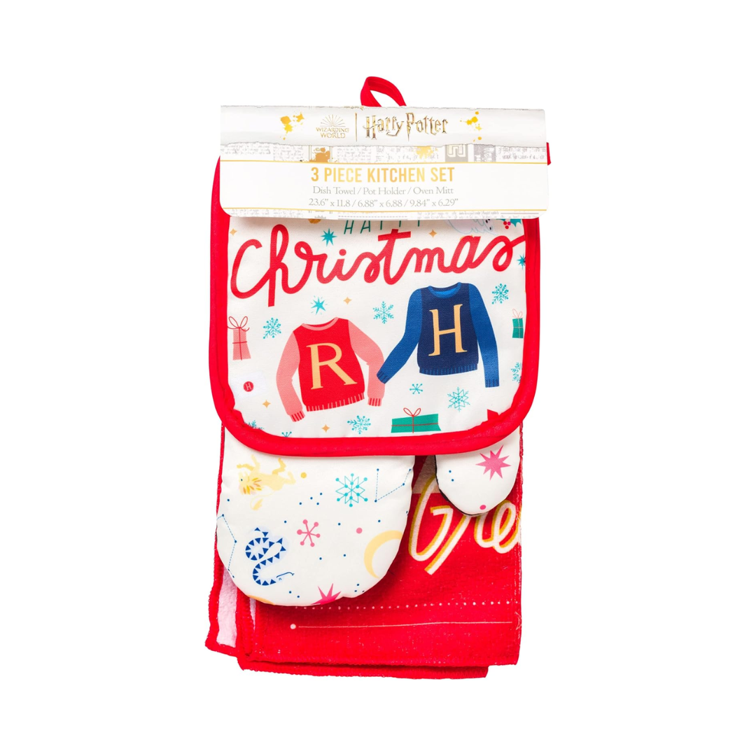 - Este versátil juego de cocina incluye una toalla de cocina, guante de horno y salvamanteles.